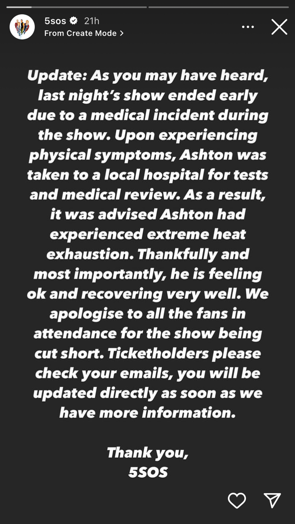 "Last night’s show ended early due to a medical incident during the show. Upon experiencing physical symptoms, Ashton was taken to a local hospital for the tests and medical review. As a result, it was advised Ashton had experienced extreme heat exhaustion."