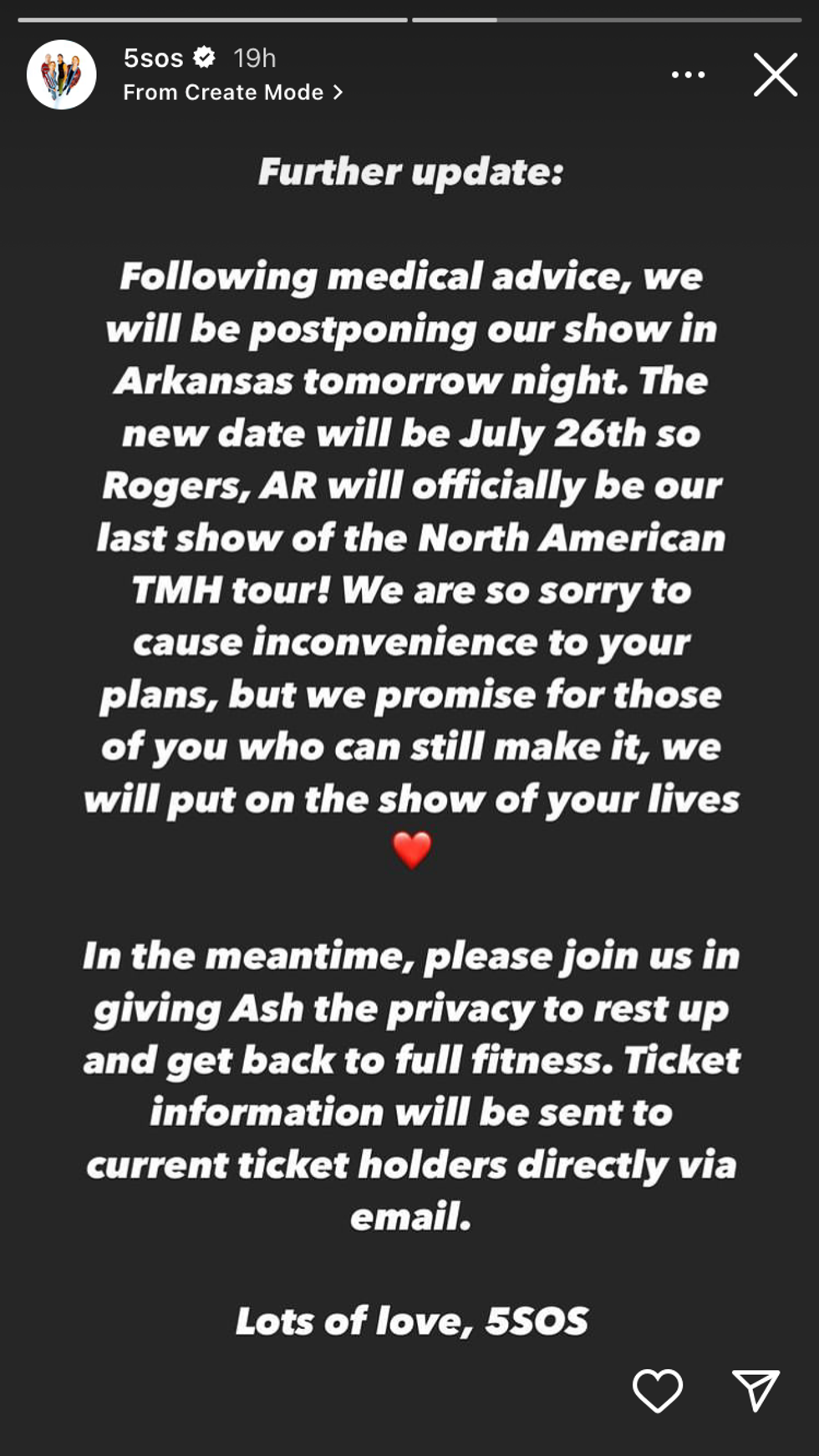 "We are so sorry to cause inconvenience to your plans, but we promise for those of you who can still make it, we will put on the show of your lives. In the meantime, please join us in giving Ash the privacy to rest up and get back to full fitness."