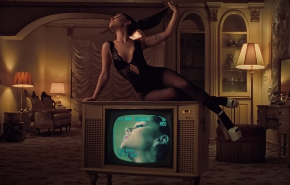 And as she turns to ask her friends, the music video resumes with the singers in a hotel room, dancing, eating and drinking. But perhaps one of the most impressive moments of the video is Grande sitting on a vintage TV that follows her facial expressions.