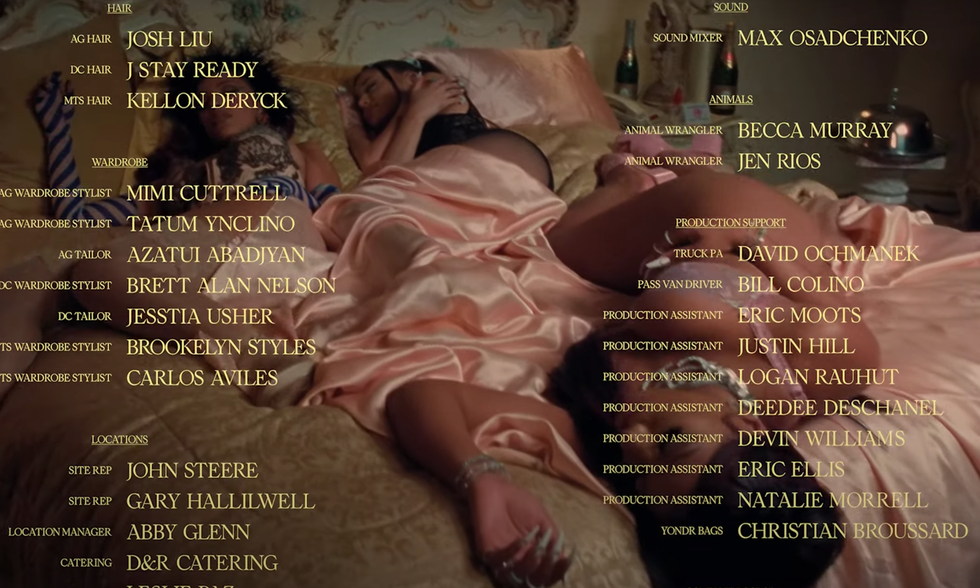 At the beginning of the music video, Grande grabs our attention sitting by the pool and reading a magazine. We quickly discover, however, that she's not alone: Doja Cat and Megan Thee Stallion are right next to her doing the same thing, ready for champagne.