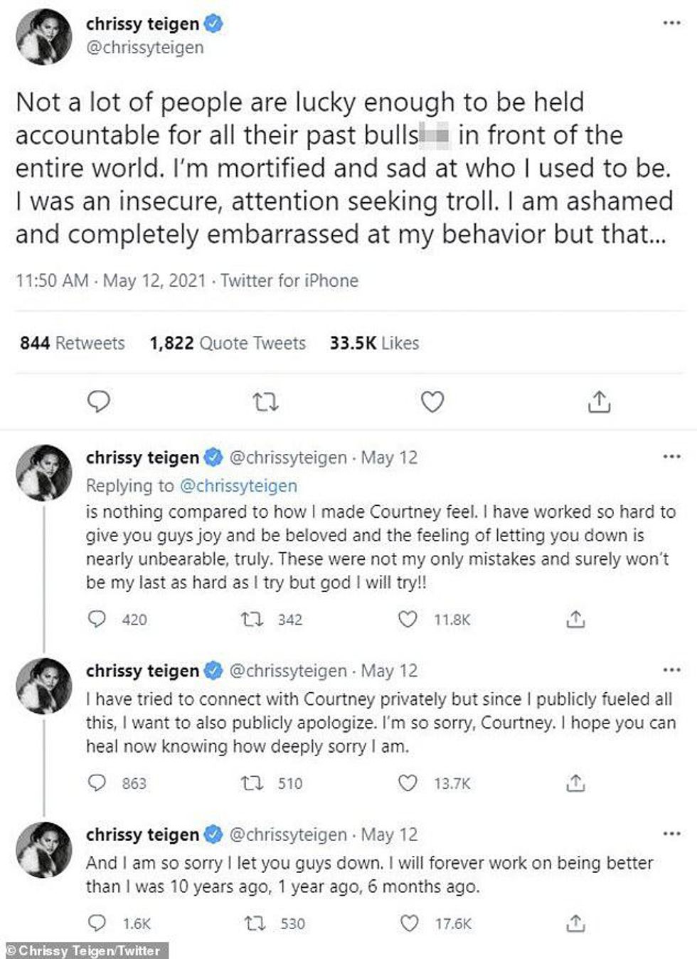 "Not a lot of people are lucky enough to be held accountable for all their past bulls**t in front of the entire world. I'm mortified and sad at who I used to be," Teigen wrote. "I was an insecure, attention seeking troll. I am ashamed and completely embarrassed at my behavior but that is nothing compared to how I made Courtney feel. I have tried to connect with Courtney privately but since I publicly fueled all this, I want to also publicly apologize. I'm so sorry, Courtney. I hope you can heal now knowing how deeply sorry I am," she concluded.