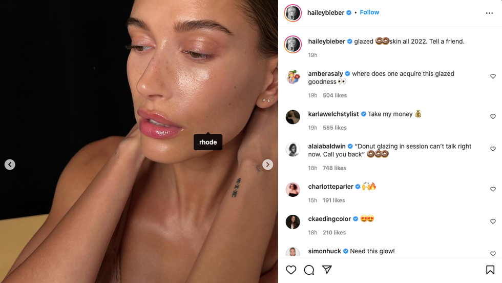 Her Instagram post on January 26th showcased her beautiful, dewy skin in a bikini. She tagged the new official Instagram account for her skincare line "Rhode". Bieber captioned the photo "glazed 🍩🍩 skin all 2022. Tell a friend" as a subtle promo for the brand. Many of her friends were in on the line and showed their support throughout the comment section. Fans also showed their sheer excitement for the launch of "Rhode".