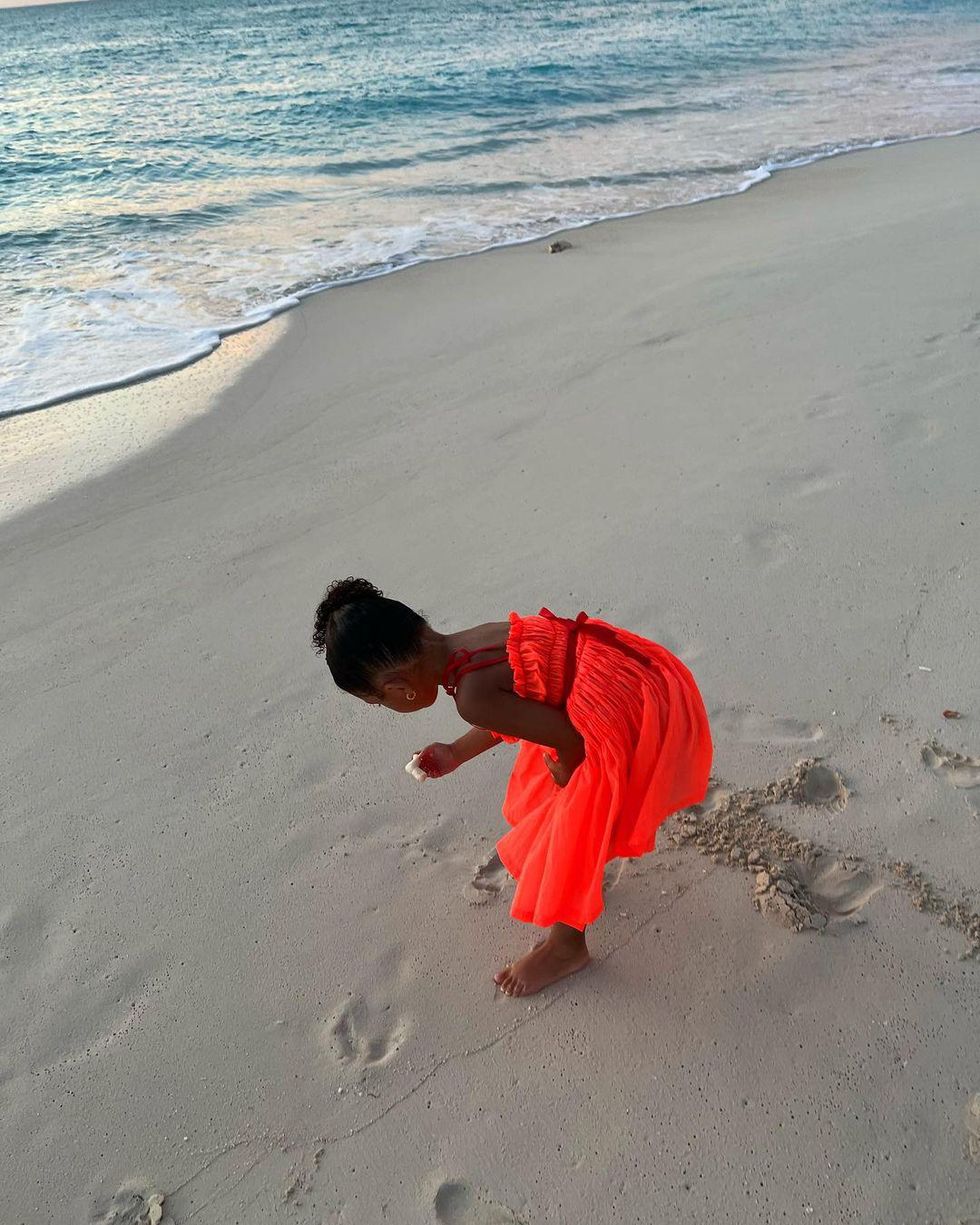 Kylie Jenner shared a photo of her daughter, Stormi, picking seashells at the beach. She wrote,