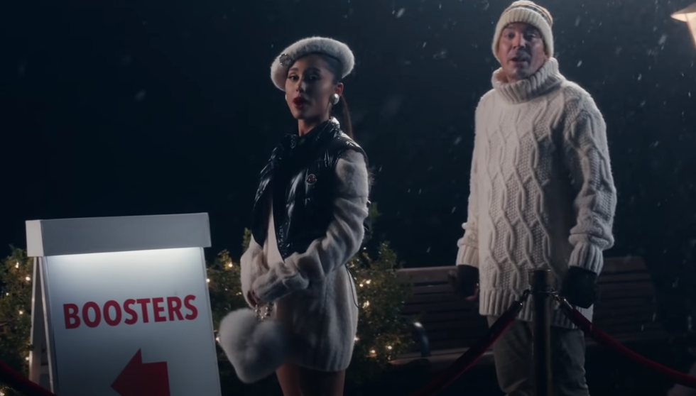 In the music video, Jimmy Fallon and Ariana Grande appear shortly after this statement, ready to ski, singing "we'll be in line for a booster."