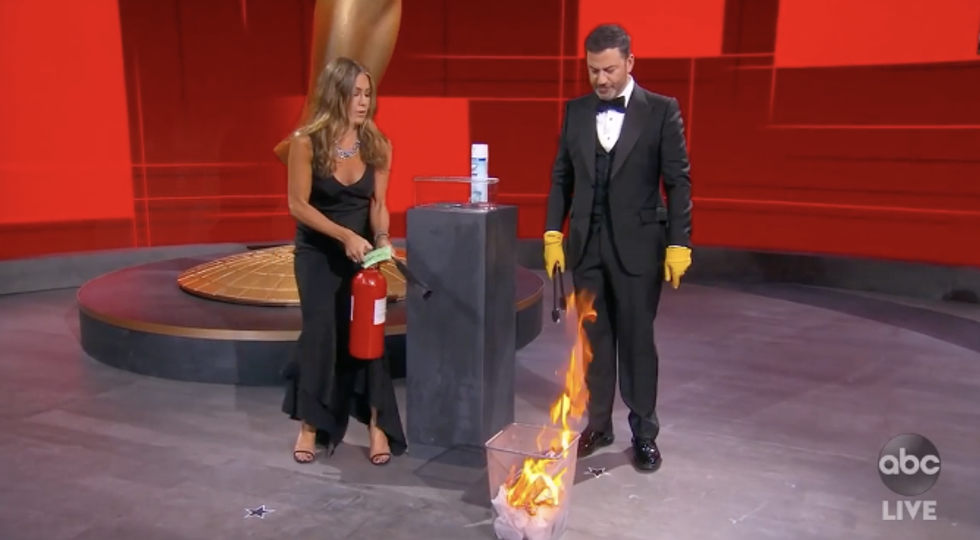 In order to ensure proper sanitization, Kimmel made sure to spray each envelope heavily with disinfectant. Taking it one step further, he and Jennifer Aniston lit the envelope on fire to rid it of any possible germs. Luckily, Aniston is good with a fire extinguisher and they were able to announce Catherine O'Hara of Schitt's Creek had won the Emmy for Outstanding Lead Actress in a Comedy Series.