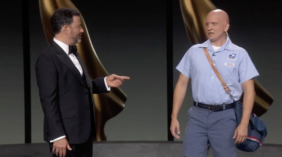 Having run out of envelopes, Kimmel got a delivery from USPS guy "Derek" -comedically played by Anthony Carrigan. The two joked about Derek's possible ties to Russia while also reminding viewers the importance of the US Postal Service and voting in the election.