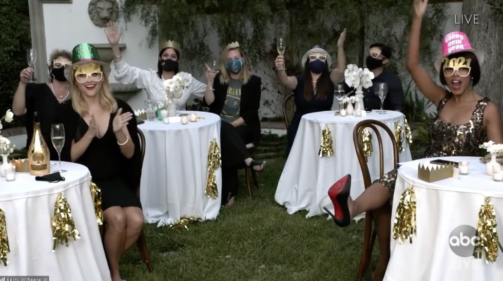 Kimmel checked in on the live feed of Reese Witherspoon and Kerry Washington who decided 2020 was over. The two producers, with friends, had their own New Year's Eve countdown and celebrated 2021. Kimmel joked, "I wish I could kiss you guys too." Kerry Washington immediately rejected the offer, "no, we don't want that. Thank you."