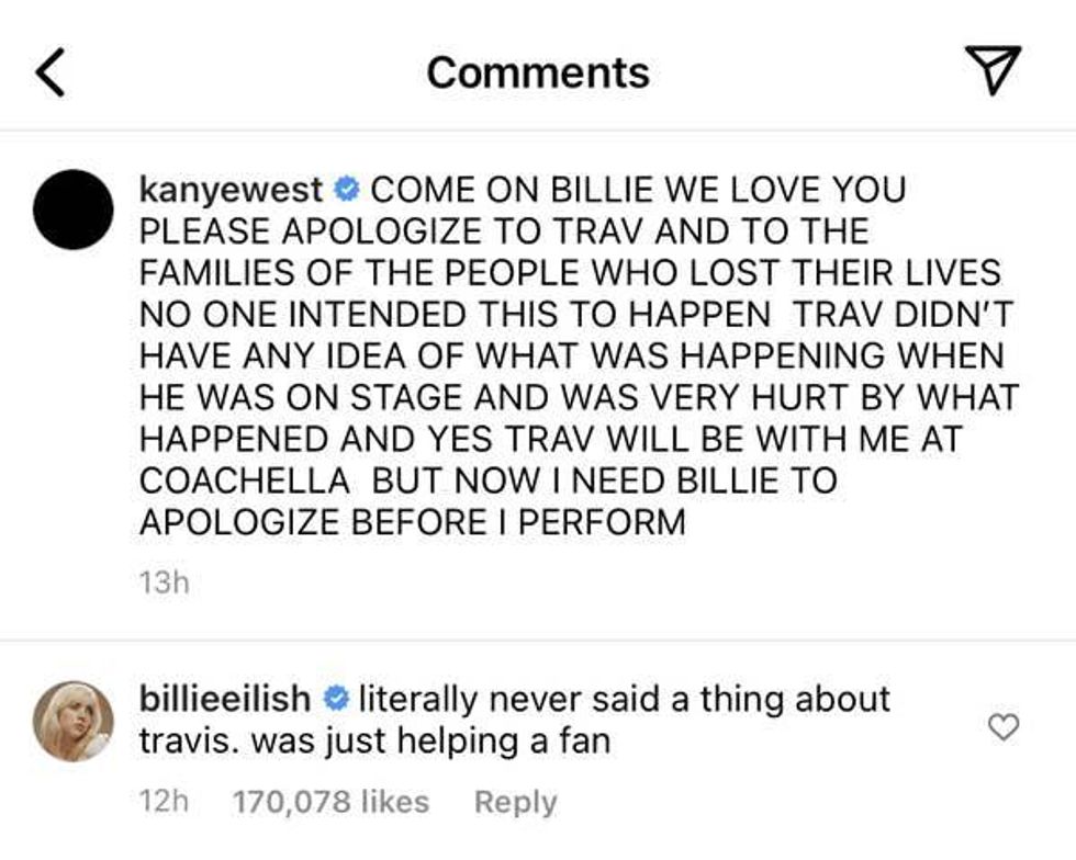 Ye quickly interpreted Billie's comment as a dig at rapper Travis Scott, who's been embroiled in controversy ever since crowd surges at his Astroworld Festival left ten dead and hundreds injured in November.