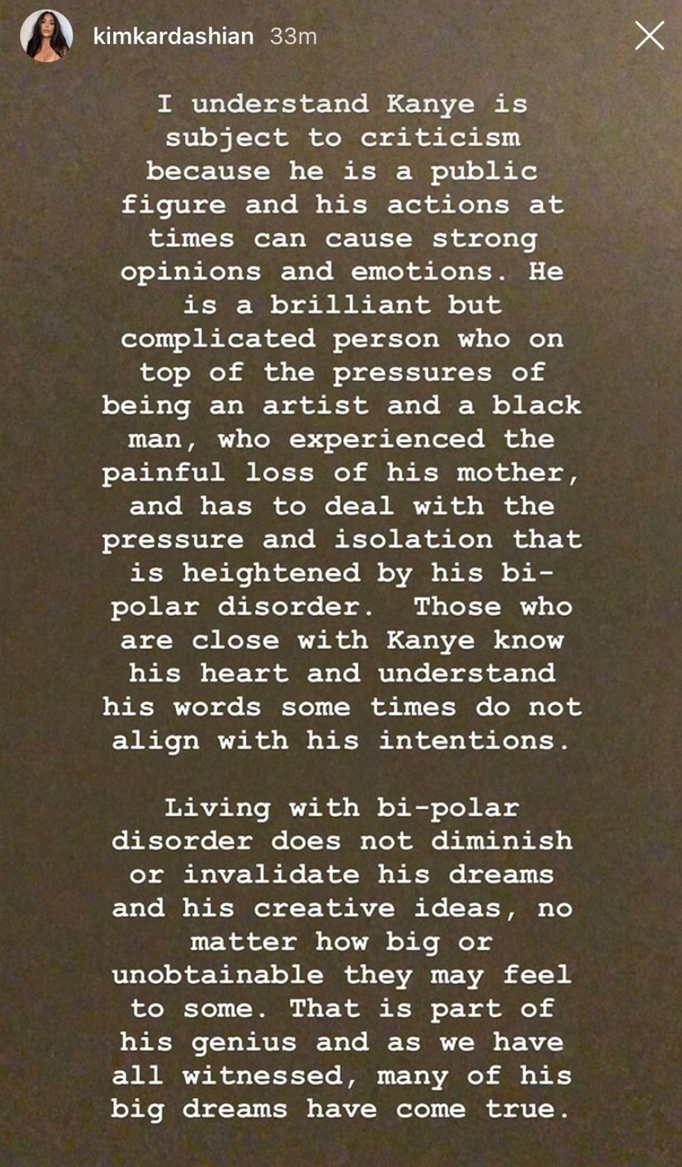 ...He is a brilliant but complicated person who on top of the pressures of being an artist and a black man, who experienced the painful loss of his mother and has had to deal with the pressure and isolation that is heightened by his bi-polar disorder...I kindly ask that the media and public give us the compassion and empathy that is needed so that we can get through this. Thank you for those who have addressed concern for Kanye's well being...