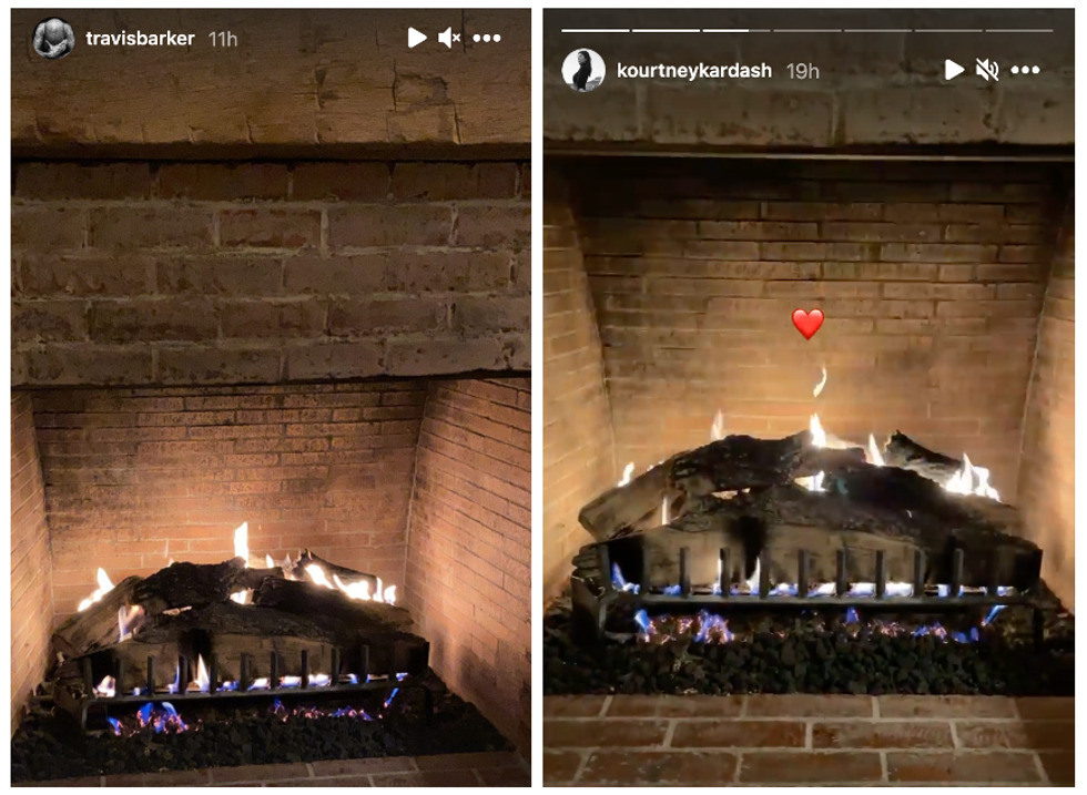 Travis Barker and Kourtney Kardashian both post Instagram stories with the same fireplace on Feb. 14.