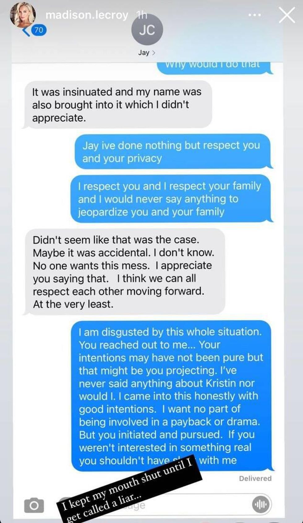 Southern Charm star Madison LeCroy, who was recently linked to Cutler, also decided to get in on the action. She took to Instagram Stories to share where she and Cutler stand.The "receipts" are from her alleged text messages with the former pro football player.