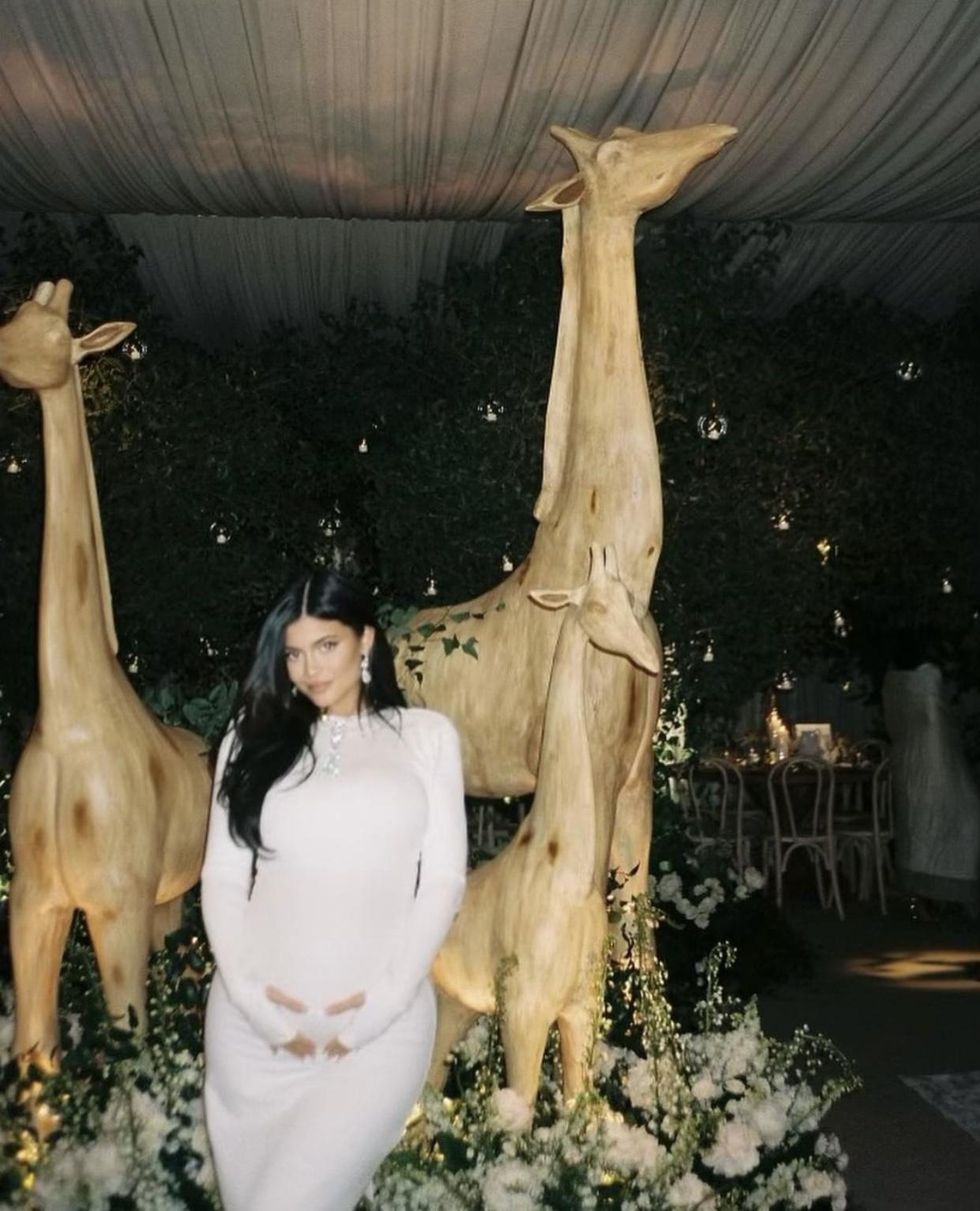 The Kylie Cosmetics founder, 24, shared a series of photos showing off her white-and-gold giraffe-themed baby shower. Jenner wore a tight long white dress, a long silver necklace, and dangly silver earrings. Many of Jenner's guests also appeared to be wearing white, silver, and rose gold shades.