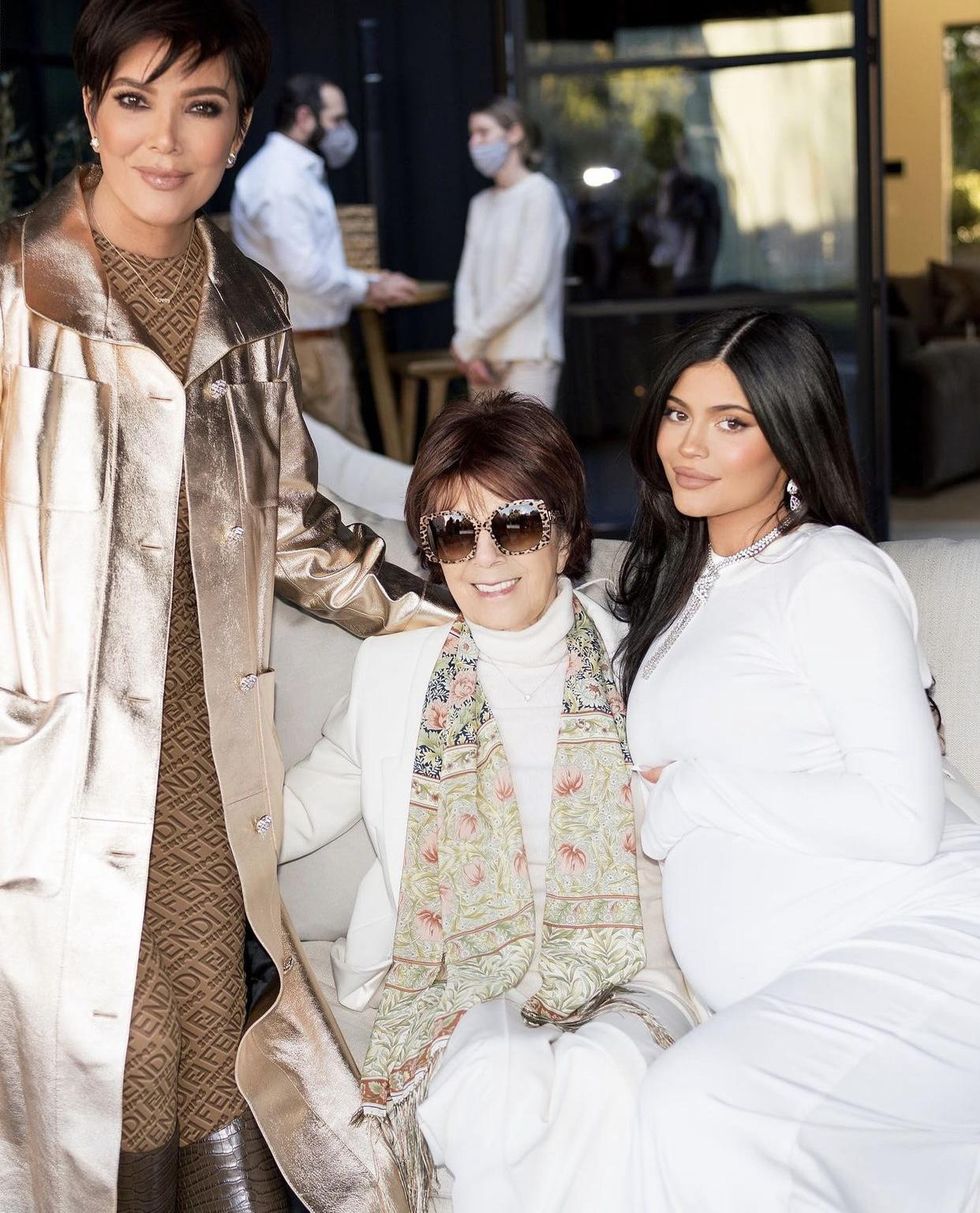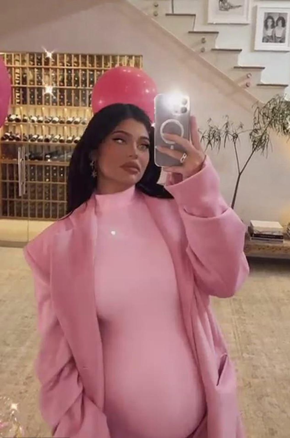 Kylie also shared a picture on Instagram stories in a long, tight, pink dress with a matching pink blazer, showcasing her bump during she and Kim Kardashian's daughters' joint birthday party.