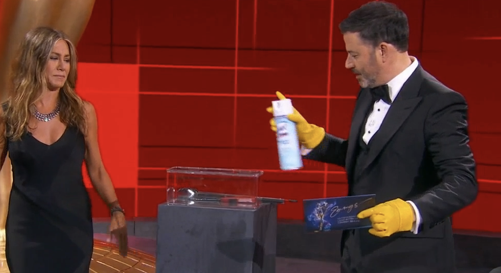 Jennifer Aniston joins Jimmy Kimmel on stage for a proper COVID protocol.