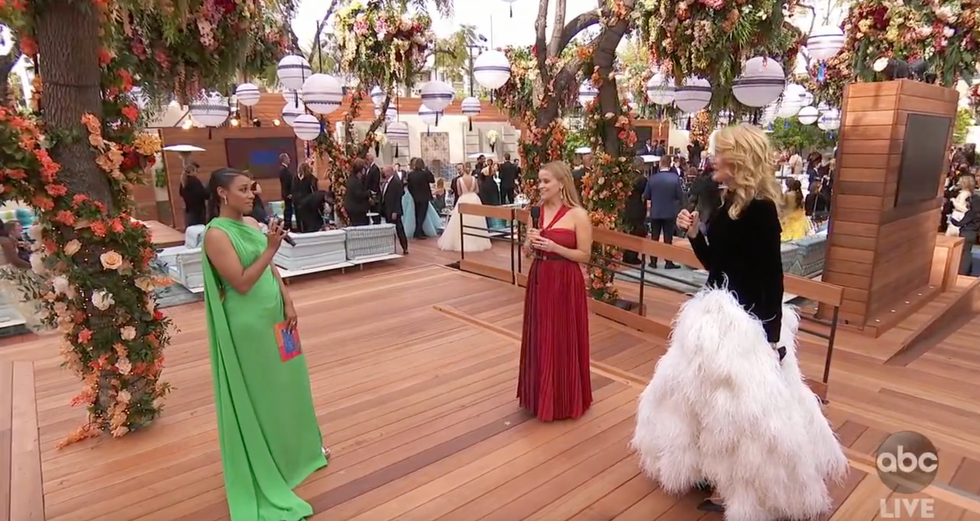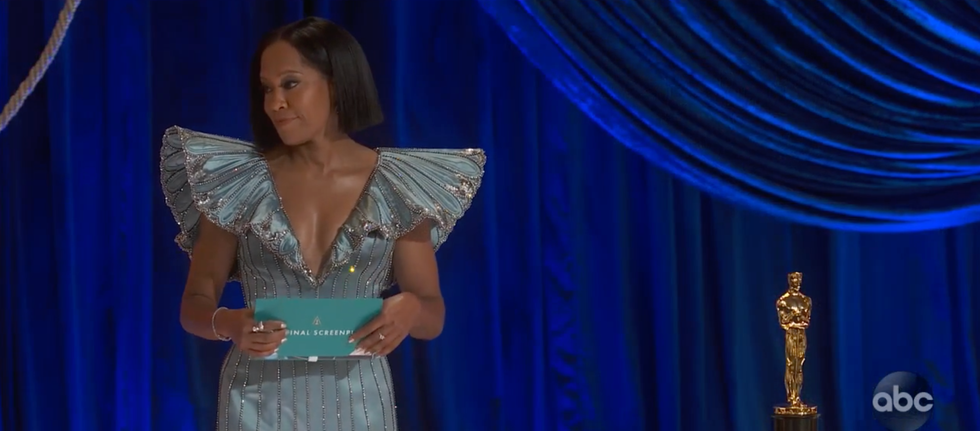 One Night in Miami director Regina King walk into Union Station in LA to kick off the 93rd annual Academy Awards.