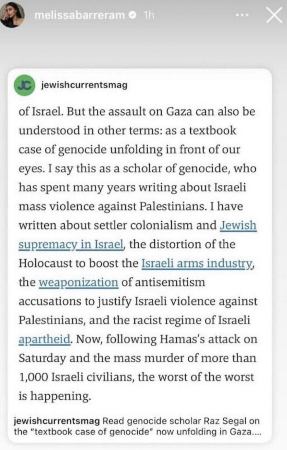 "Gaza is currently being treated like a concentration camp," Barrera wrote in a post to her Instagram story. "Cornering everyone together, with no where to go, no electricity no water. People have learnt nothing from our histories. And just like our histories, people are still silently watching it all happen. THIS IS GENOCIDE & ETHNIC CLEANSING."