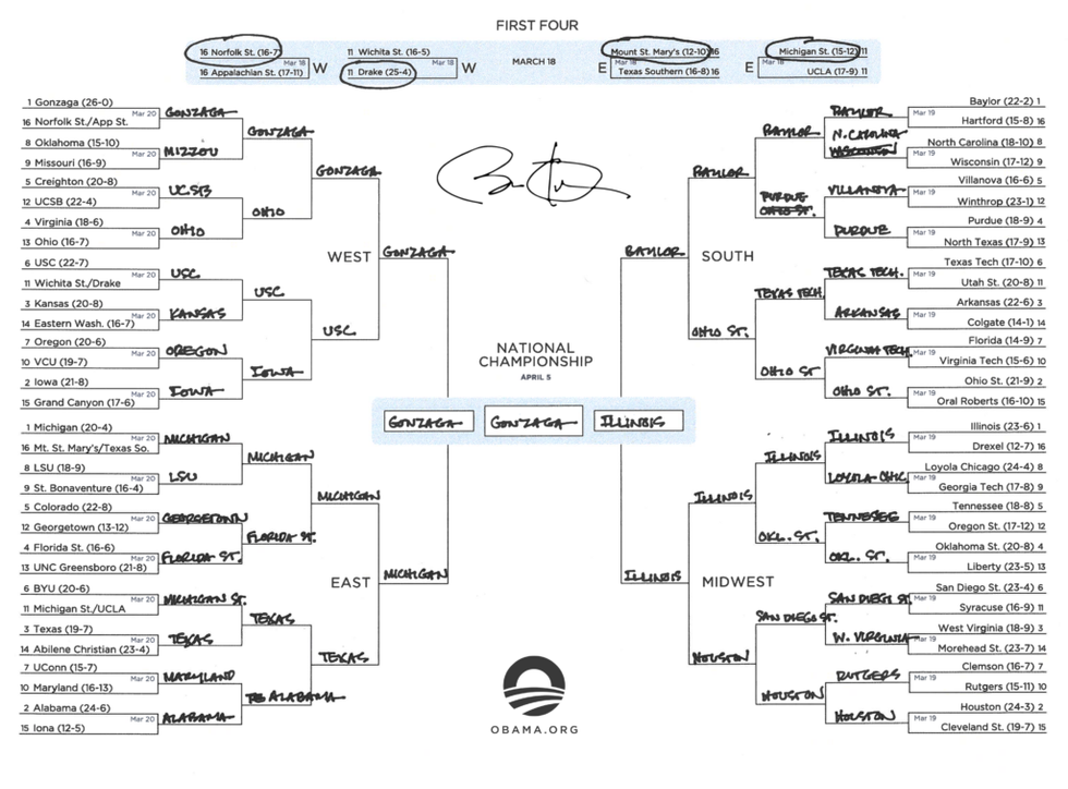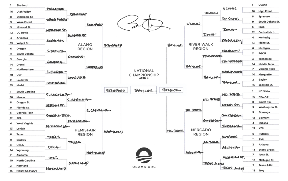 In the Women's Bracket, Obama has a final four of Maryland, NC State, Stanford, and Baylor, with a final game of Stanford v. Baylor, ending in a victory for the Baylor ladies. That's not a bad pick, given that aside from UConn's nine, Baylor has the most tournament wins all time with three.