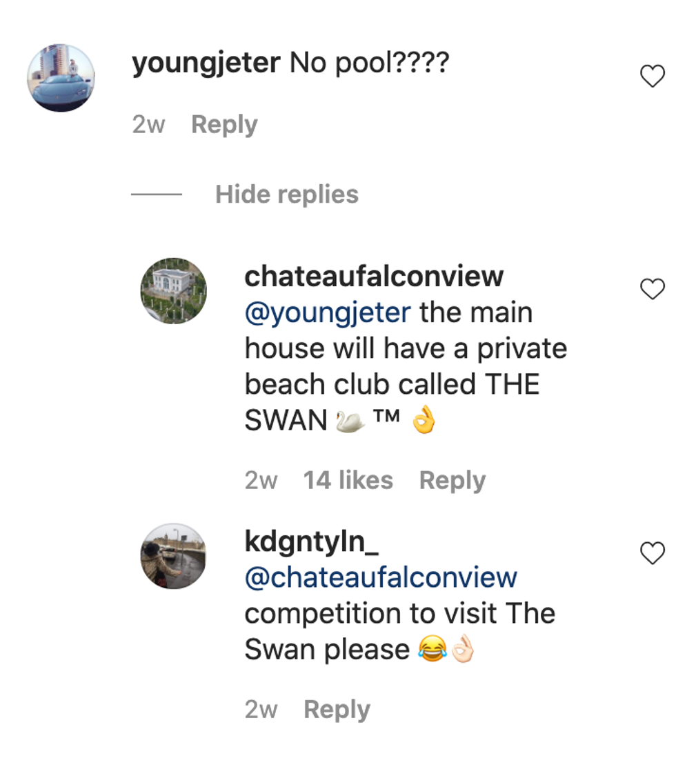In an Instagram post, one commenter wonders if this mansion has a pool. The Chateau Falcon View account replies to them, saying that there will be a private beach club, called "THE SWAN."