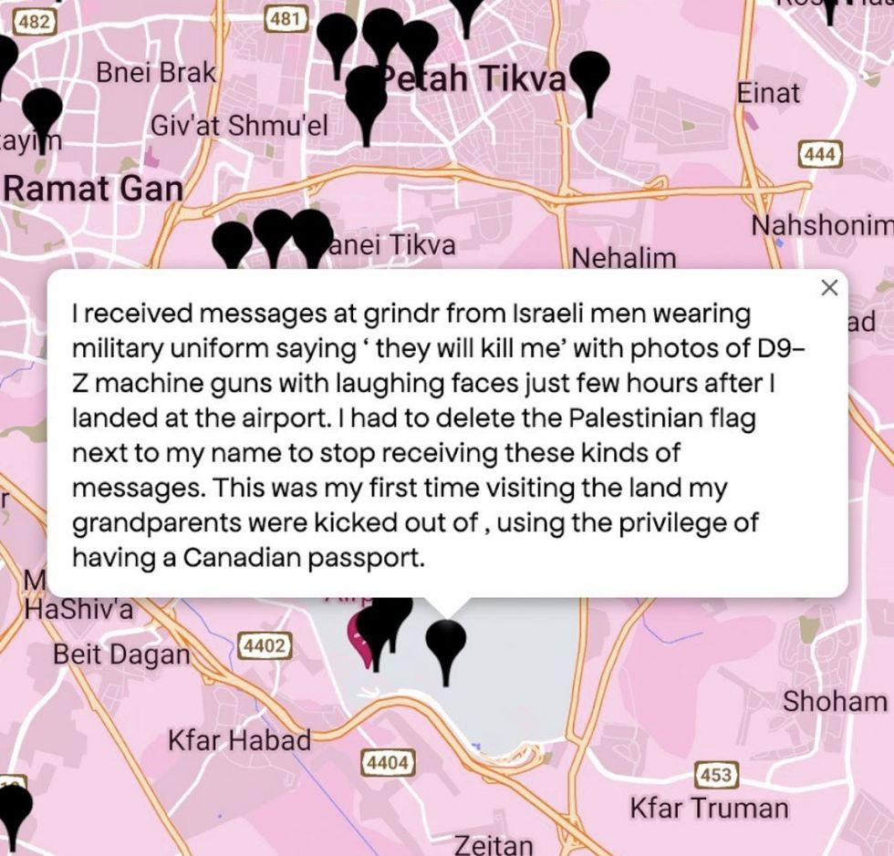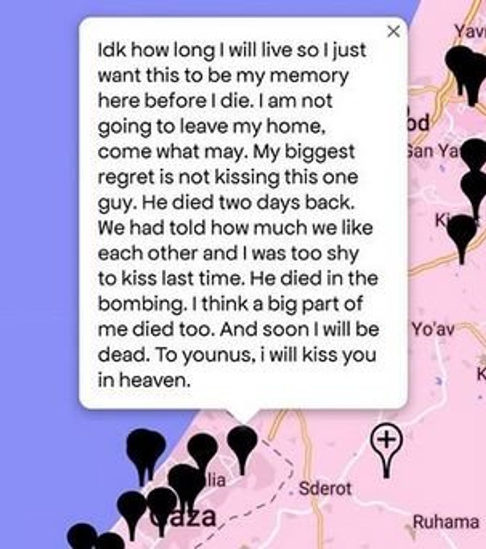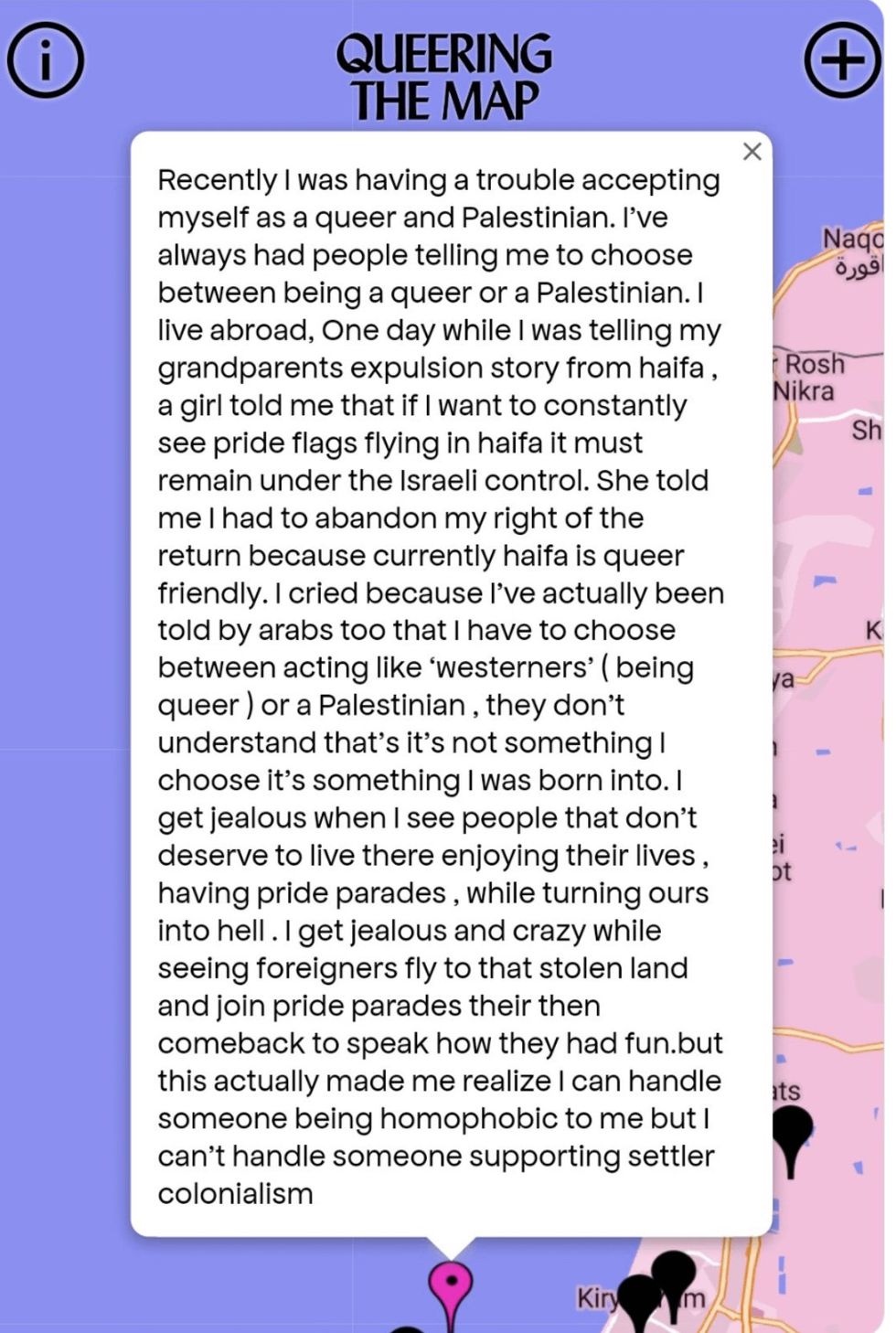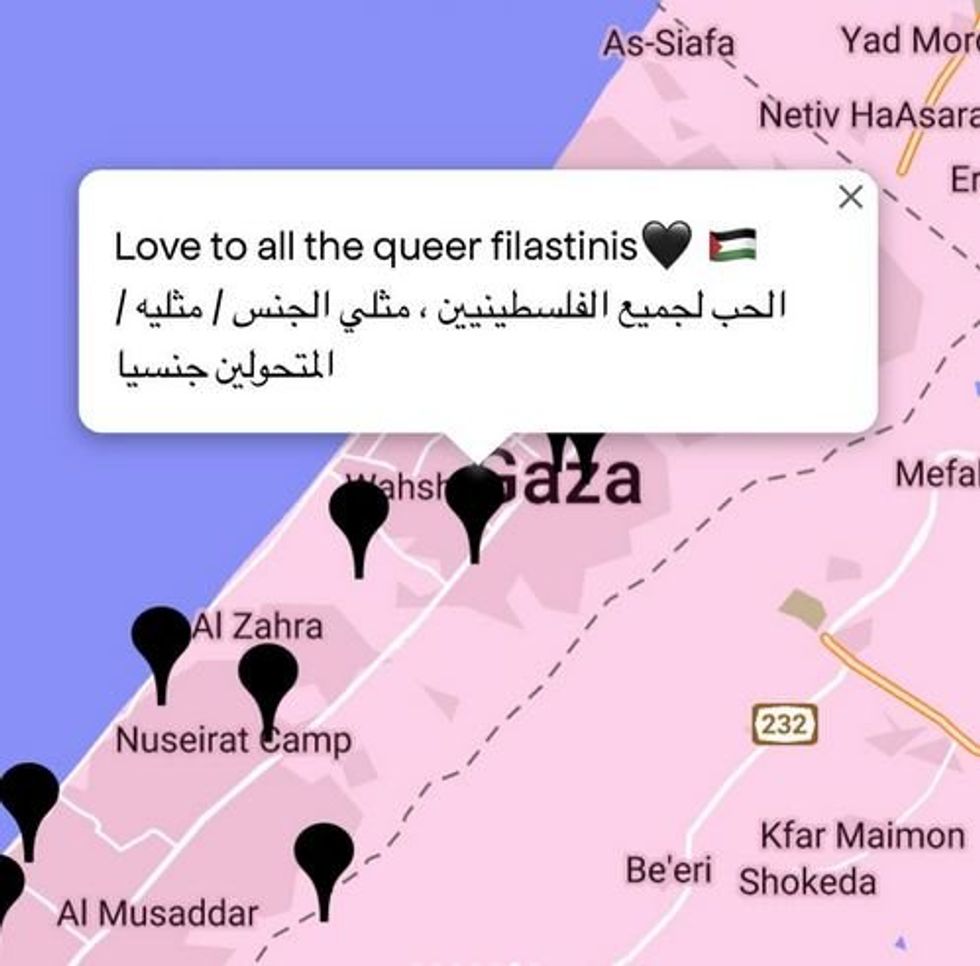 On Queering the Map, several LGBTQ+ Palestinians have flagged spots where they've had romantic encounters in the Gaza Strip. Others have mourned their lost loved ones, while some have called for the liberation of the Palestinian people.