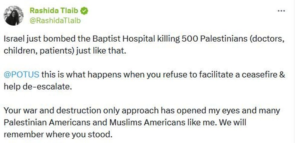 "Israel just bombed the Baptist Hospital killing 500 Palestinians (doctors, children, patients) just like that," she wrote on X, formerly known as Twitter. "@POTUS this is what happens when you refuse to facilitate a ceasefire & help de-escalate. Your war and destruction only approach has opened my eyes and many Palestinian Americans and Muslims Americans like me. We will remember where you stood."