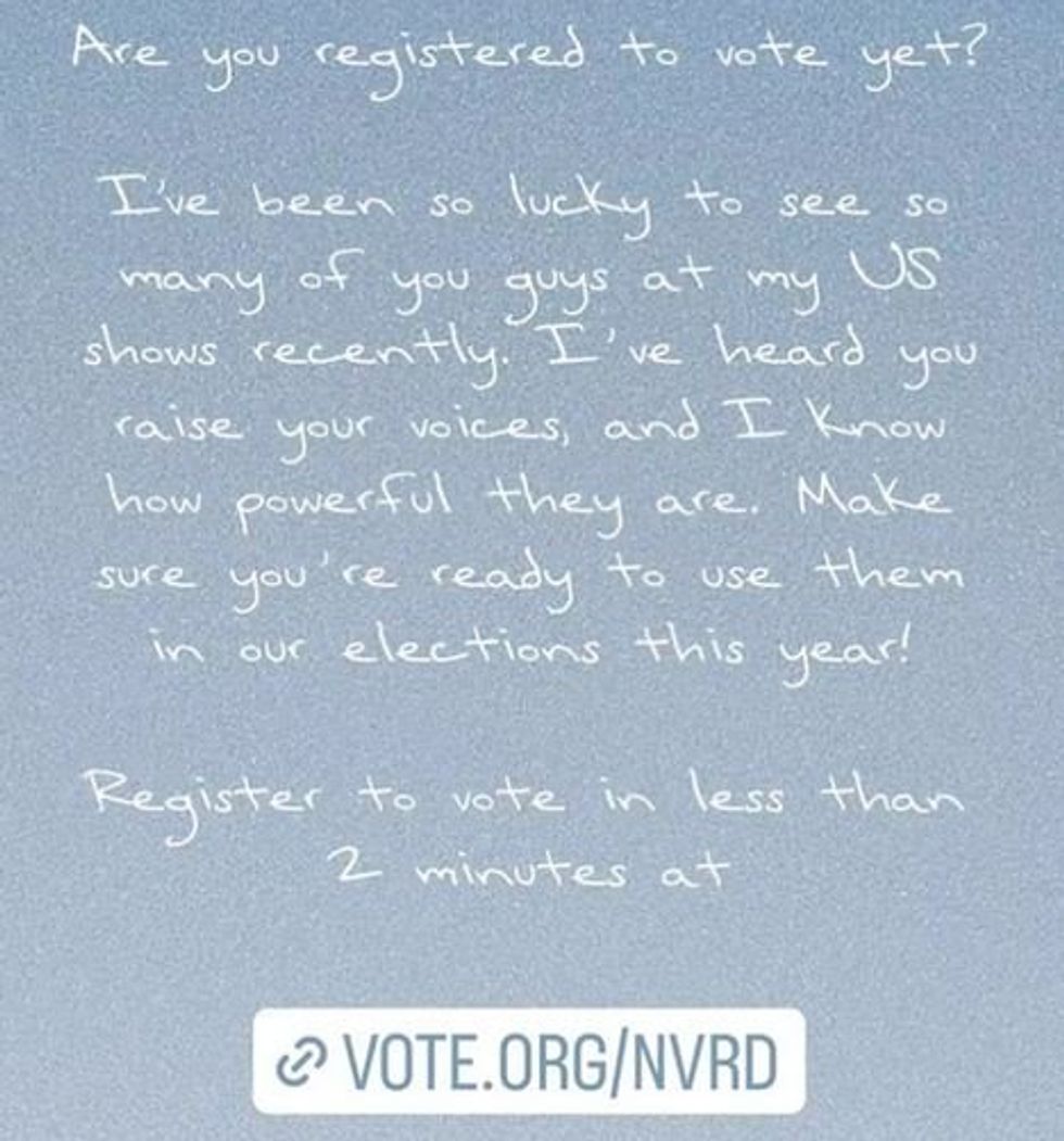 "I’ve heard you raise your voices, and I know how powerful they are,” she continued. “Make sure you’re ready to use them in our elections this year! Register to vote in less than 2 minutes at vote.org/nvrd.”