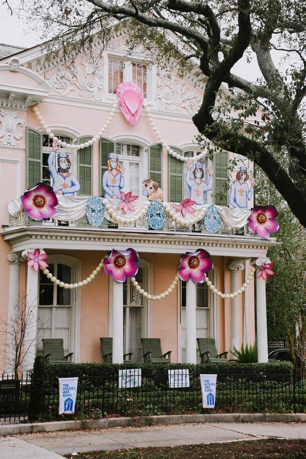 One house was decorated in tribute to the first responders of this pandemic. The house is filled with life size cut out of healthcare workers with masks showing the flour-de-lis symbol that associates with New Orleans.